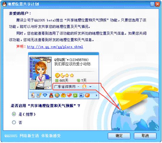 答:是的。“共享地理位置和天气预报”功能是腾讯在QQ2005 beta3推出的一项新服务,只有使用QQ2005 beta3及以上版本,才能享受到这项服务。