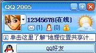 答:当您安装了QQ2005Beta3版本后,第一次登录时,QQ主面板上会有一个选择“共享地理位置”的提示,显示为一个黄色的小消息条。