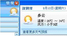 在主面板的右上角会出现您所在城市的天气状况大图标,鼠标移上后可以看到您的地理位置信息和当天的天气情况,点“查看更多天气预报”可以查看更详细的天气预报。