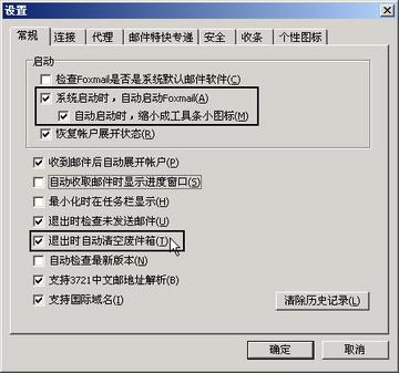 同时,被剔除出来的垃圾邮件会自动放到“废件箱”中,选择“工具→系统设置”,在“常规”标签中勾选“退出时自动清空废件箱”即可让Foxmail在关闭时自动把这些垃圾邮件清除出去(如图)。
