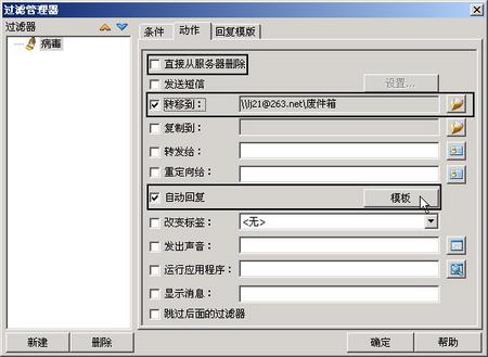 设置完了条件标签,接下来就要开始设置“动作”标签了(如图)。单击“过滤器管理器”窗口的“动作”标签,在这里可以对符合条件的邮件设置各种自动执行的动作,其中包括“直接从服务器删除”“转移”“拷贝”“转发”“自动回复”等功能。如果勾选了“直接从服务器删除”复选项,则满足上述条件的病毒邮件就会在服务器上删除掉了。