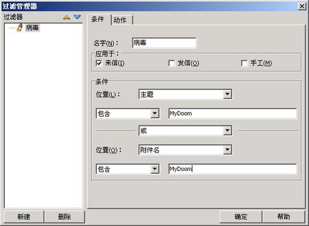 例如:你设置一个“病毒”过滤器。在第一个条件处依次选择“主题”、“包含”、“MyDoom”,完成第一个条件的设置,即该条件为“在主题中包含MyDoom”。如果仍需要其他的条件设置,可继续依次选择“或”、“附件名”、“包含”和“MyDoom”,那么此过滤器设置的条件即为“在主题中包含Happy99并且或在附件名中包含Happy99”。所有满足这些条件的邮件将被通通过滤掉。