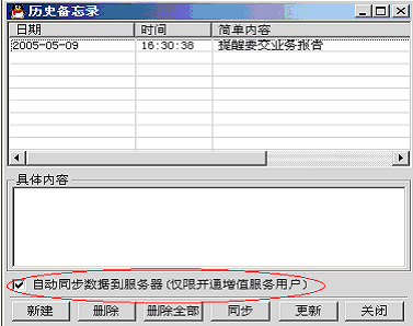 点击确定后,如果用户已选择"自动同步数据到服务器",则系统将自动将刚建立的备忘录存储到QQ服务器;如果没有选择自动同步,用户只能点击"同步"按钮对服务器上的备忘录进行手动更新。