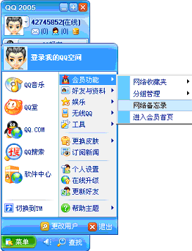 登录QQ后,选择菜单中的"会员功能"-"网络备忘录"(如下图)就可以打开"历史备忘录"的对话框。
