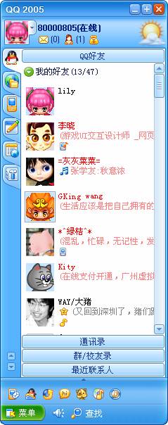 QQ2005界面采用深蓝色的主色调,全面提升了界面的立体感和光泽度。拥有完美质感的同时,细节性的曲线设计也足见深厚的UI功底,充满艺术美感。正式版全面精简了面板,并增加了多项支持自定义的组件设置,更好的满足用户个性化需求。