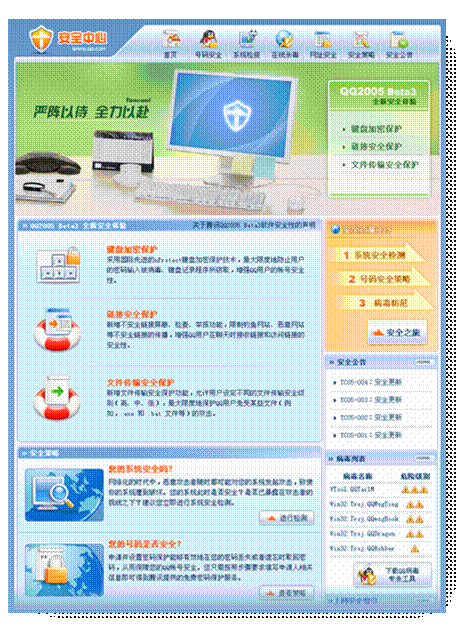 是否曾经经历QQ密码被盗的困惑?恶意链接的骚扰?QQ尾巴病毒的感染? Beta3新增键盘加密保护、链接安全保护、文件传输安全保护三大全新安全体验,结合QQ安全中心站点,严阵以待,全力以赴,全方位保护您的QQ安全。更多安全贴示,详见QQ安全中心站点。