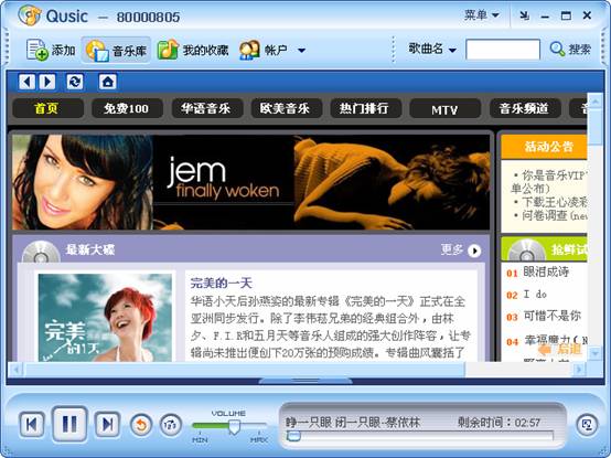 QQ音乐是中国大陆地区唯一与四大唱片公司:环球、华纳、百代、SONY&BMG都签署在线音乐合约的公司,向用户提供正版音乐服务。歌曲库包括华语、欧美歌曲,总数达20万以上。音乐是一种心情,想和好友一起分享您的音乐心情么?QQ2005正式版实时显示您的在线音乐状态,好友点击即可一起分享。让音乐拉近你和她的距离。