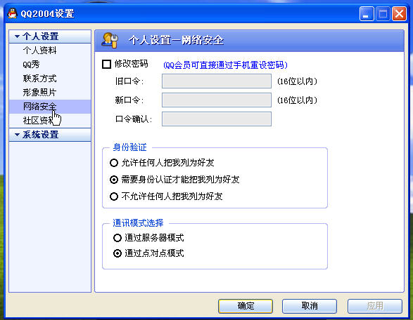 首先,在个人设置中“网络安全”里的“通讯模式”选择“点对点”模式。
