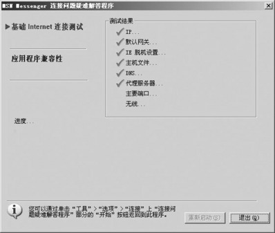 在网络出现问题时,单击MSN Messenger主窗口中的菜单“工具/选项”,在打开的窗口中选择“连接”选项,然后单击“连接问题疑难解答程序”区中的“开始”按钮,随即系统将会启动侦测程序(如图)。