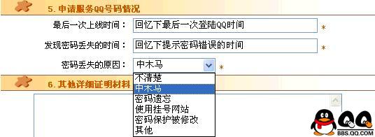 第六步:输入申请服务QQ号码情况,包括最后一次上线时间、发现密码丢失时间、密码丢失原因,请仔细回忆后如实填写。