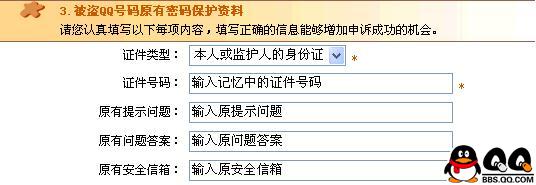 第四步:输入QQ号码原密码保护资料,包括密密码保护提示问题、密码保护提示问题答案、安全信箱地址、记忆中的证件号码。之前没有申请过密码保护资料或者忘记,在填写号码申诉表时,建议您可在原有密码保护资料栏中输入您需要修改的密码保护资料。