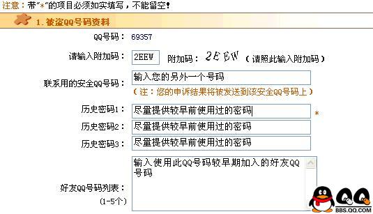 第二步:输入历史密码(一到三个)和历史好友(一到五个)。在历史密码和好友QQ号码中,建议您提供号码丢失半年、甚至更长时间以前使用过的历史密码,以及在使用此QQ号码较早期加入的好友QQ号码。