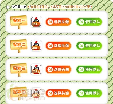 选中上面“使用此功能”前的复选框,然后就可以对一周中每天要更换的头像进行设置,在这里我们以周一为像进行说明。点击周一右侧的“选择头像”按钮,在打开的“头像选择”窗口中,可以选择会员免费头像(如图3所示)。