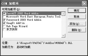 知道了这一秘密,对于再“霸道”的工具栏我们也能对付了——将不需要的工具栏前面的对勾去掉,下次启动Word时该工具栏就不会出现了,如不选中“FastAIT 2002 Word Addin”,即可去掉金山快译的工具栏;不选中“SnagIt Add-in”,可去掉如SnagIt 7.0的工具栏。