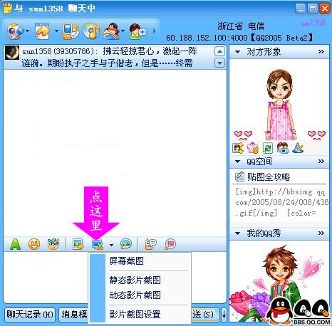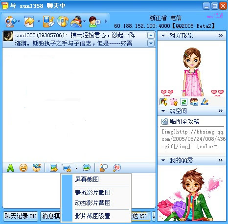 如果是静态画面会立即将捕捉所得显示在聊天窗口中,如果是动态的则要稍稍等一段时间才出现在窗口中,按下Esc可结束捕捉,再发送过去,对方就会看到所捕捉的动态画面。这时,呈现在你聊天对话框中的就会是一张精彩的动、静态影片截图了。