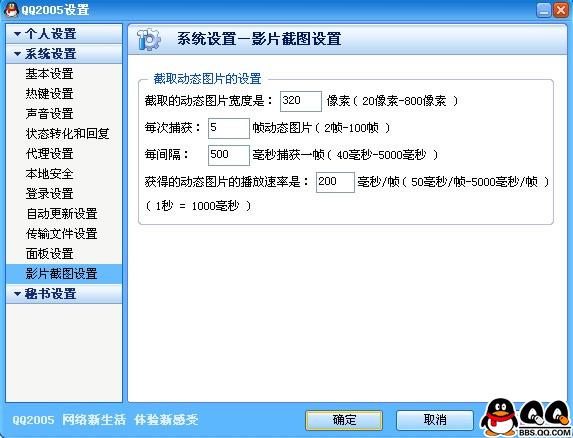 在“菜单”-“系统设置”- “影片截图设置”中可详细设置截取动态图片的宽度、每次捕获帧数、每帧的时间间隔及动态图片的播放速度。