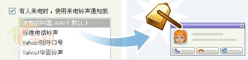 在雅虎通里,您可以改变不同的来电铃声;也可以针对不同的好友设定不同的来电铃声。还可以导入各种不同的铃声喔!情歌表示情人捎来甜言蜜语,警报声是老板来电,电子音乐通知好友要来约 Party!