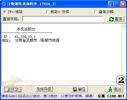 笔者使用的是QQ纯真IP数据库(点这里下载腾讯QQ IP数据库 纯真版Build 1115)中附带的IP数据库查询程序检查本机的IP地址,使用起来也非常方便,如图2所示,点击“本机IP”就可在窗口中显示本机的IP地址。