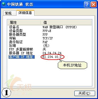 检查本机IP地址的方法很多,如果你的系统是Windows XP,而且使用的是用Windows XP的连接向导创建的Internet连接,那么最简单的方法就是在系统通知栏右击连接的图标,然后在菜单中选择“状态”,在弹出的话框中就有远程服务器和本机的IP地址(如图1)。