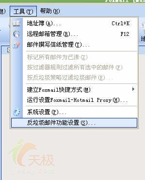 在菜单栏工具选项中打开最后一项反垃圾邮件功能设置