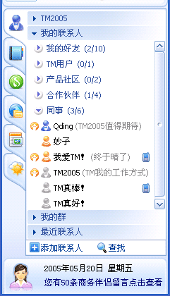 TM和QQ一样,是免费产品。但和不同的是,TM更适合办公环境中使用,侧重于熟人间的沟通和联系。QQ则更多提供沟通、娱乐等方面服务。