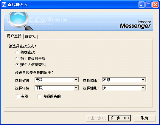 选择“按工作信息查找”方式,选择行业、省份、城市以及用户在线情况进行查找,同时还可以进一步查看各用户个人名片中的内容。