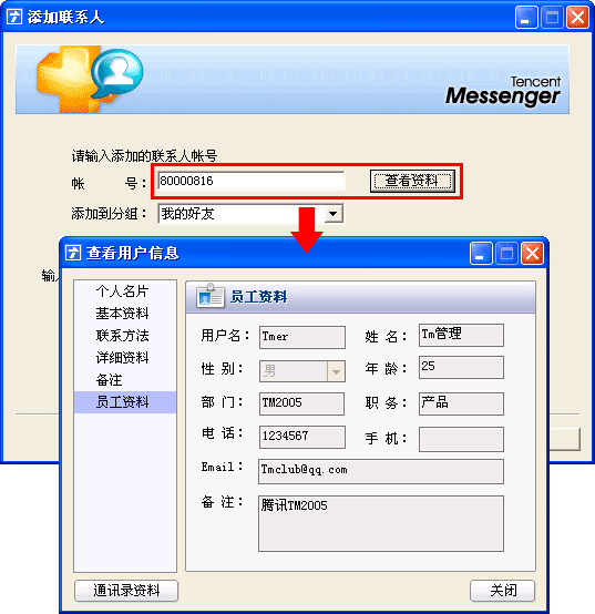 您可以通过直接输入联系人的Email,QQ号码,手机号码添加联系人,点击“查看资料”可以查看用户信息。点击“添加”可以直接添加联系人。