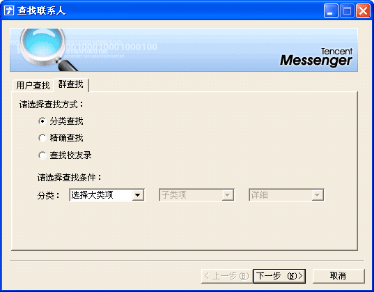 在群查找里面,可以通过“分类查找”、“精确查找”和“查找校友录”等查找方式查找到群。在“分类查找”中可以通过选择群的分类自由的查找你想加入的群的位置;在“精确查找”中,只能通过输入群号码进行查找;若选择“查找校友录”,您将进入校友录主页进行查找。