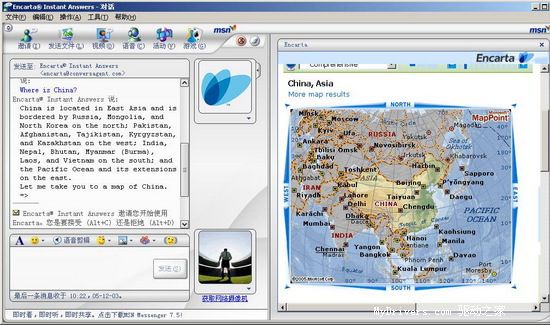由于BBC电视无福消受,Encarta倒是个很棒的百科全书,小编就把encarta@conversagent.com加为了好友。聊了几句,发现这个小机器人真是聪明绝顶。小编的第一个问题是中国在哪里,小机器人不但准确回答,还邀请使用Encarta并随后在右侧窗口显示了一幅地图,标明了中国的地理位置。之后的问题小机器人也回答得相当不错,而且右侧窗口不断更新,以适应相关问题。在小编偏离话题问起其它问题的时候它还会引导回Encarta方面。有兴趣的读者可以和它聊聊,当然,需要使用英语。