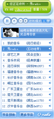 注:收听模式1是P2P的收听方式,模式2是传统流媒体的收听方式,您可以自由选择,确定您喜欢的收听效果进行收听。