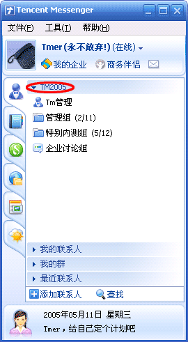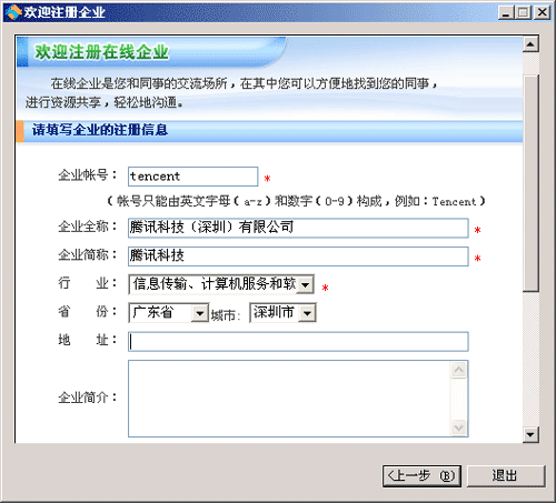 点击Tencent Messenger主面板上面的“我的企业”,呈现“欢迎使用在线企业“窗口,选择“注册新的企业,把您的同事邀请进来”;