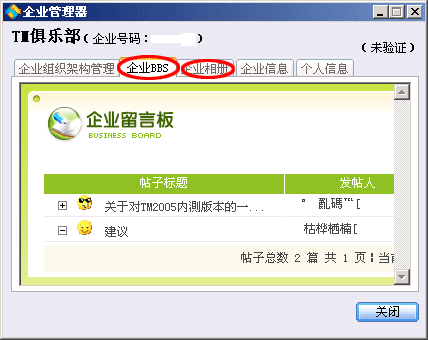 通过点击TM主面板上的“我的企业”,在企业管理器窗口中点击“企业BBS”和“企业相册”,管理员可以通过点击操作栏中的图标,对BBS中的帖子和企业相册中的相册和照片分别进行相应操作。