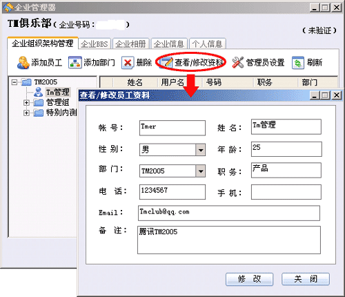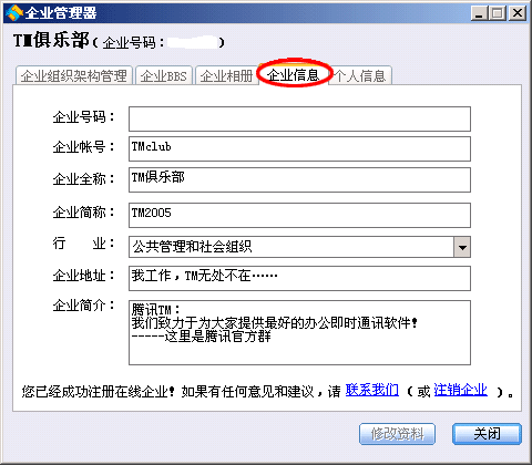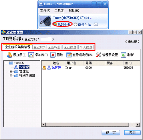 在TM主面板上方点击“我的企业”,出现如图“企业管理器”窗口。在此窗口中,管理员可以对企业进行管理。包括企业组织架构管理、企业BBS、企业相册、企业信息和个人信息五部分内容,如图上方的五个页面选项。
