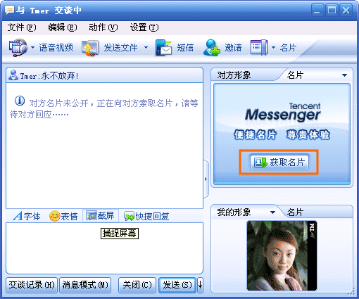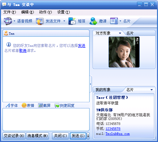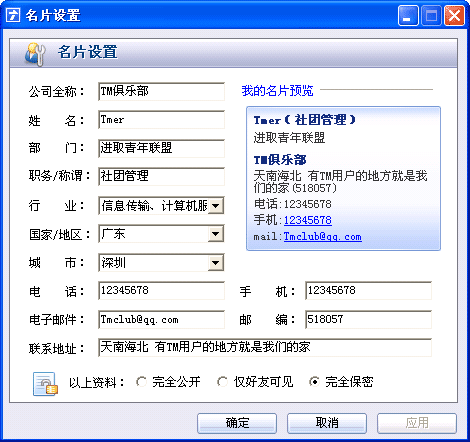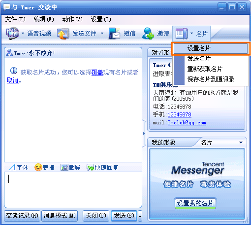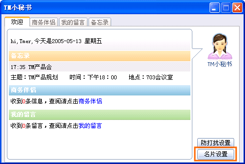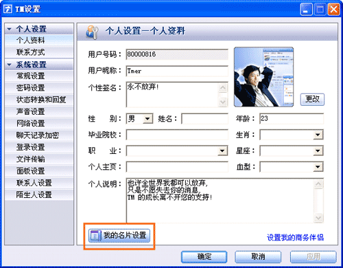 TM2005beta1版本对名片的设置、发送及索取进行了全方位的完善和提高。您可以通过在TM的个人设置中点击 来设置您的名片,