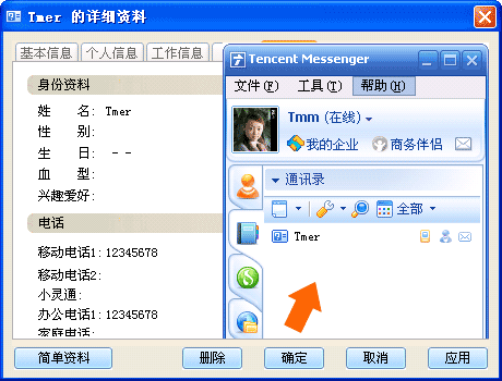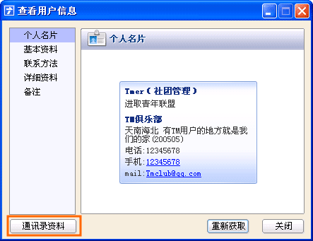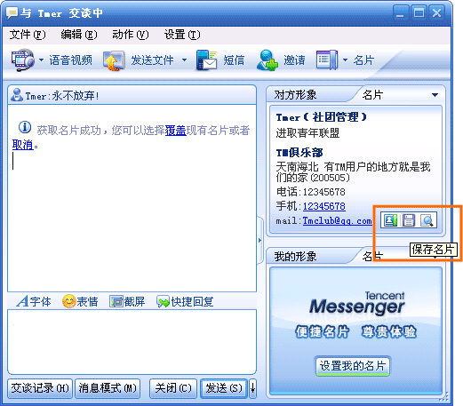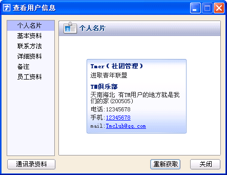 TM2005中特别提供了将名片保存到通讯录的功能,在您获取到好友的名片后您可以选择保存名片,或是在查看对方信息的界面中选择