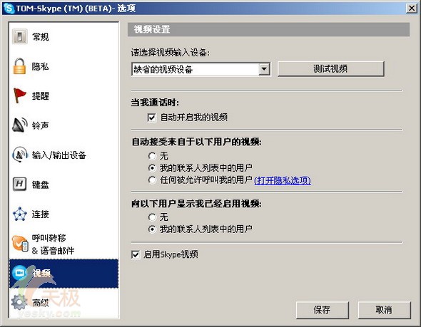 如果你不想让其它人看到你的视频,或是只想让部分人看到你的视频,可以通过“视频选项”进行设置。依次点击“工具――选项――视频”菜单,在这里可以对视频进行详细设置,如不想开启自己的视频功能,那么去掉“启用Skype视频”复选框中的对号即可。如果不想在通话时自动打开自己的视频,这时只要去掉“自动开启我的视频”前的复选即可。在这里我们还可以设置哪些人可以看到我们开启了视频功能,或是只接受指定用户的视频(如图6所示)。