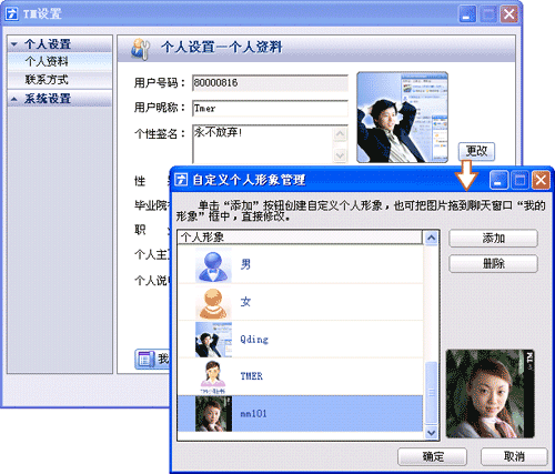 在TM的菜单“文件”—“我的资料”—“个人设置”—“个人资料”中,您可以设置自己的照片等作为个人形象图片,可以是任何类型的静态图片或gif类型的动态图片。
