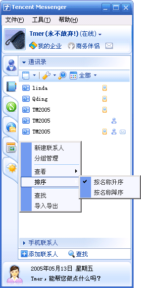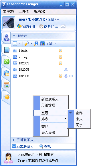 点击TM主面板上TM通讯录标签进入通讯录面板,如图所示,您的联系人排列于通讯录中。右键单击空白处,在如图菜单中点击查看,您可以选择查看指定组中的联系人。