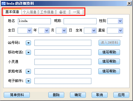 点击联系人姓名前的 图标,显示该联系人的详细资料,如图。通过查看各页面查看相关信息。