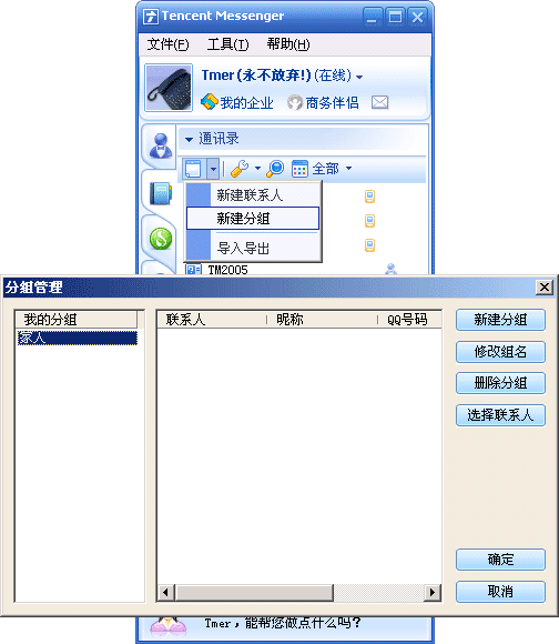 在如图的下拉菜单中选择“新建分组”,在分组管理页面中,你可以新建联系人分组、修改组名、删除分组等。建立分组后,点击“选择联系人”将选定的联系人放于相应的组中,便于管理。