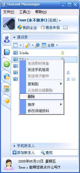 若要在联系人列表中删除某联系人,则鼠标右键单击该联系人姓名,在弹出菜单中点击“删除”即可。