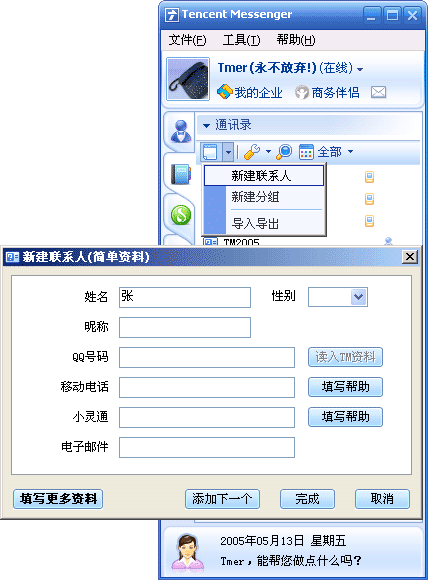 您可以利用TM通讯录添加您的联系人,TM通讯录可为您记录联系人的所有基本信息。在TM通讯录面板中,您只需简单操作,即可实现向联系人发送手机短信、发送电子邮件等操作。