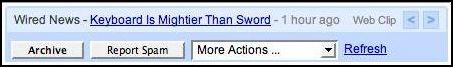 支持RSS:通过Gmail屏幕顶部的“Clips”浏览你喜欢的RSS feed。显示来自blog的clips,新闻站点和其他在线资源。挑选最新的头条,随机的流行feeds,或者添加任何你想要的RSS/Atom。(《Gmail推出新功能:Web Clip》)