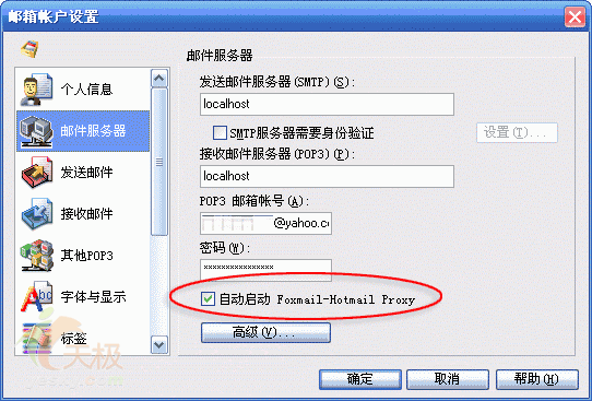 【小提示】 由于Foxmail 6采用了一种特殊机制对Yahoo邮箱进行收发,所以即使您没有使用上述过程激活自己邮箱的POP3服务时也是可以直接在Foxmail 6中进行邮件收发的,只不过一定要记住,在帐户的设置过程中要确定选择上“自动启动Foxmail-Hotmail Proxy”这个选项时才可以的。如图5所示