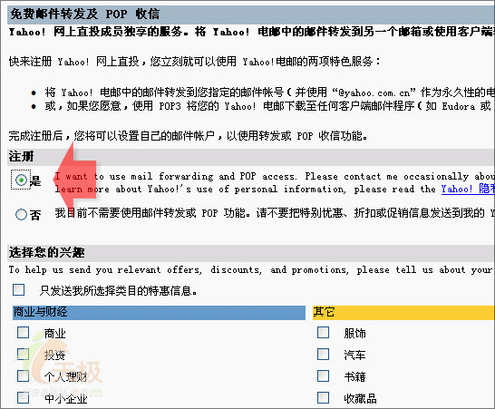 3. 在弹出的如图2所示页面中确认选择好图中箭头所标识的那项功能(大致意思就是说我想申请Yahoo的网上直投服务以获得免费的POP收信服务),然后再点击页面下方的“完成”按钮