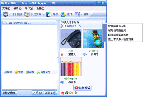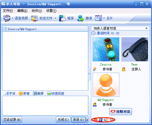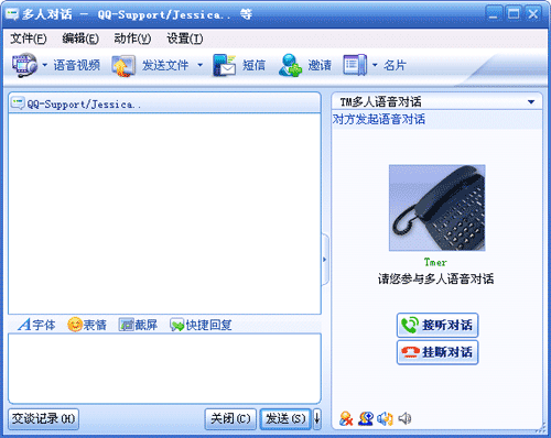 在进行多人语音对话时,您同时还可以通过窗口的对话框发送文本消息、发送文件、发送短信以及进行其它TM功能活动。