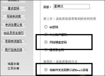首先你的号码要有密码保护,打开网页“http://service.qq.com”,输入QQ号和附加码后点击“立即取回密码”按钮,在第二步输入密码保护的正确答案,在第三步选择“网络硬盘密码”(如图),在第四步选择“将邮件发送到默认的Email信箱”,然后点击“下一步”按钮。