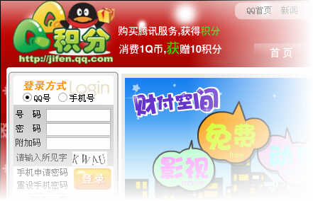 打开网址http://jifen.qq.com后,在左侧的登录框中输入你的QQ号、密码以及附加码后(如图),点击“登录”按钮,登录成功后可以在页面中看到你目前拥有的积分。