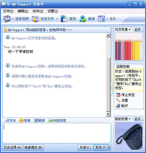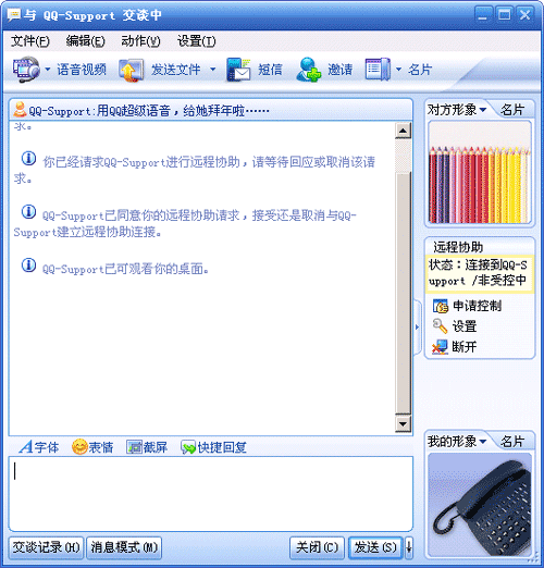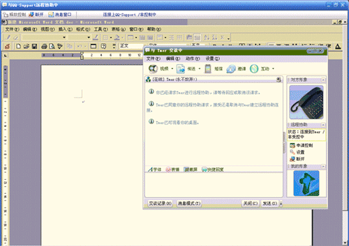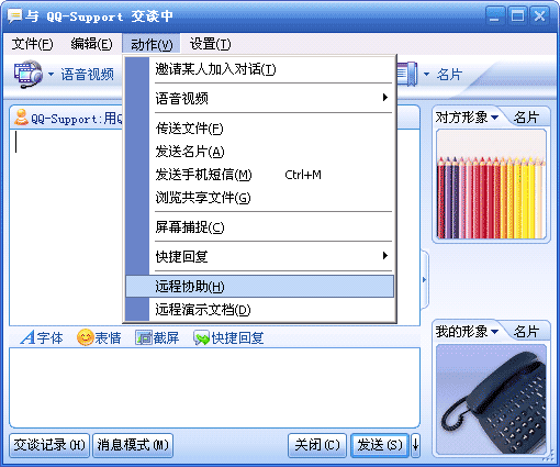 在对话窗口中,选择“动作”->“远程协助”,即可向对方发起远程协助的请求,对方接受后,进入远程协助状态。