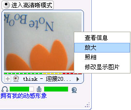 点击圈圈聊天室窗口的视频图像旁的那个小三角,会看到“放大”按钮,或者还可点击“进入高清晰视频”都可以把图像放大。